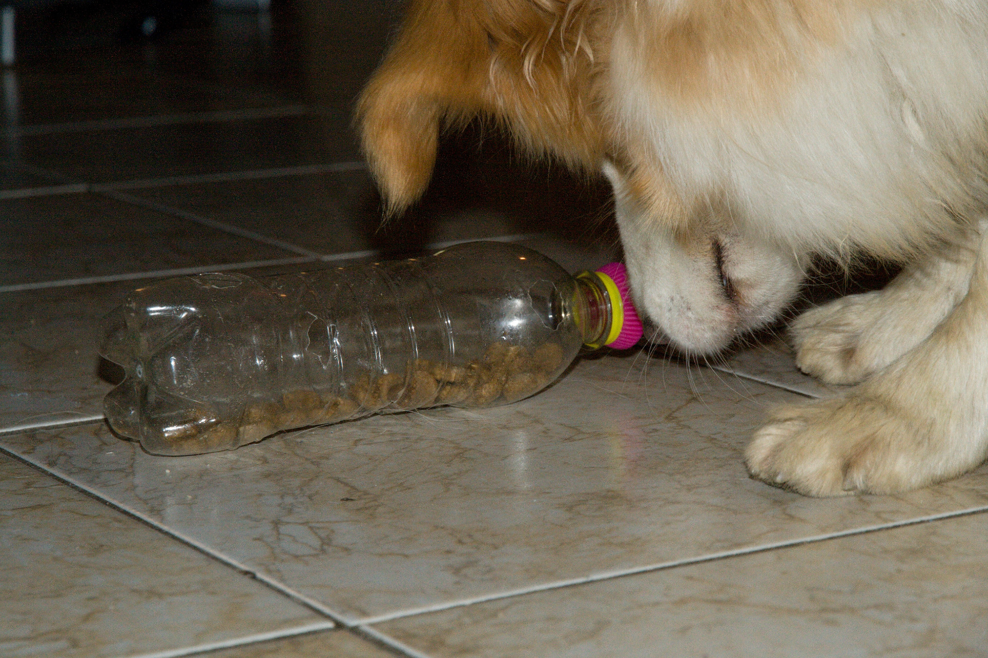 Petku má doma opravdu každý. Důkladně ji vymejte a pomocí odlamovacího nože či nože, co máte po ruce, udělejte do petlahve několik děr, tak velkých, aby jimi prošla granulka či pamlsek. Zabrousete kraje pilníkem, aby nebyly tak ostré. Do petlahve nasypte hrdlem granule/pamlsky a zašroubujte víčkem. Pejskovi položte petku na zem (položte ji tak, aby ležela) a on už sám vymyslí, jak na to. Když do petlahve šťouchne čumákem protočí se a granulky propadnou otvory. (Tento hlavolam už je o trochu obtížnější než předešlý. Proto do něj dejte pejskovi větší množství granulí, bude tak mít větší ůspěšnost.)