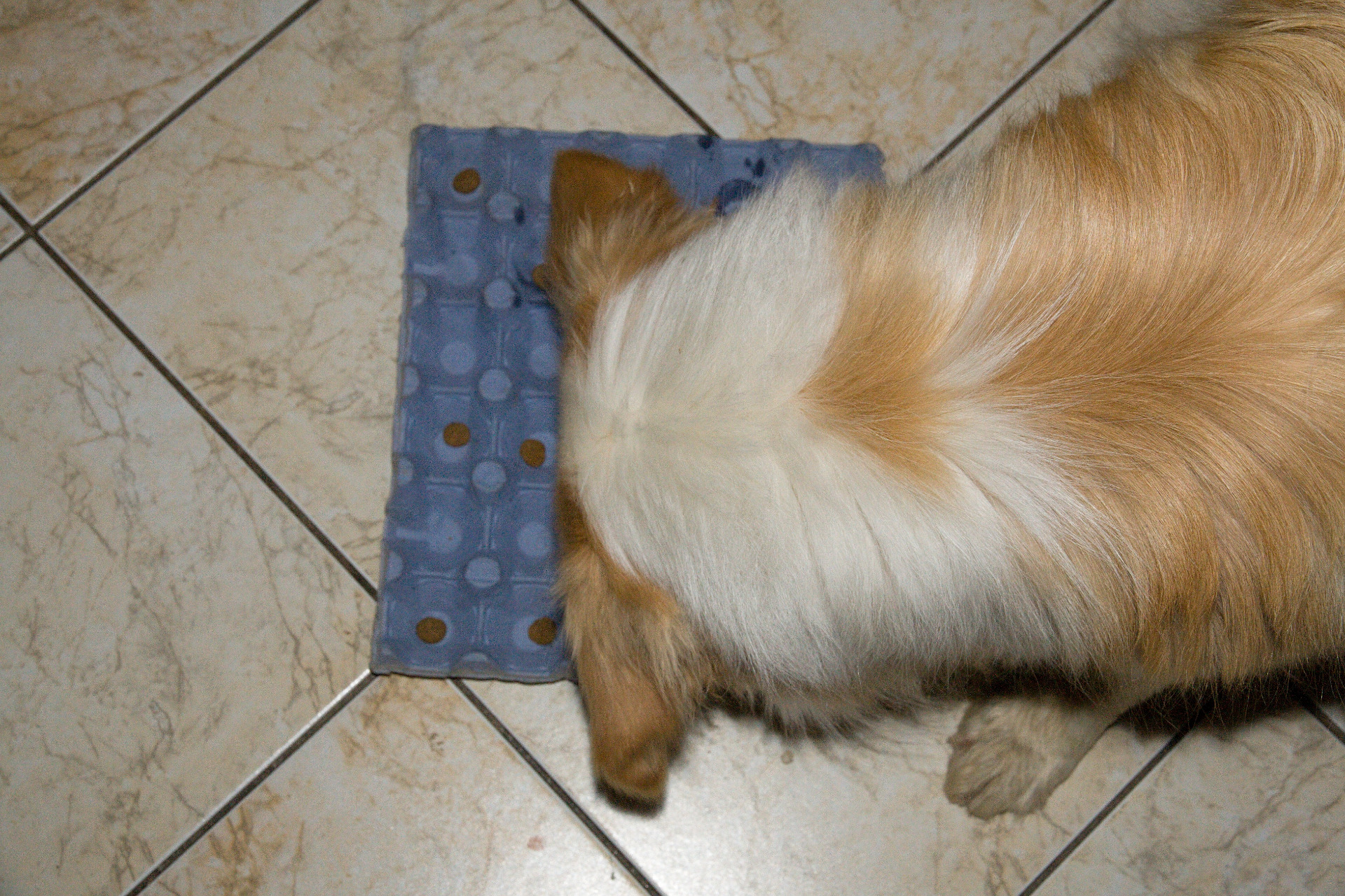 Není nad to si nějaké to plato od vajíček schovat. (Doporučuji uchovat, co největší.) Dá se využít právě jako hlavolam. Princip je jednoduchý. Do jamek dávejte granule . Někam víc, někam míň. Ačkoliv se to zdá primitivní, větším pejskům to trochu zabrat dá. Chce to totiž větší obratnost jazyku. :D