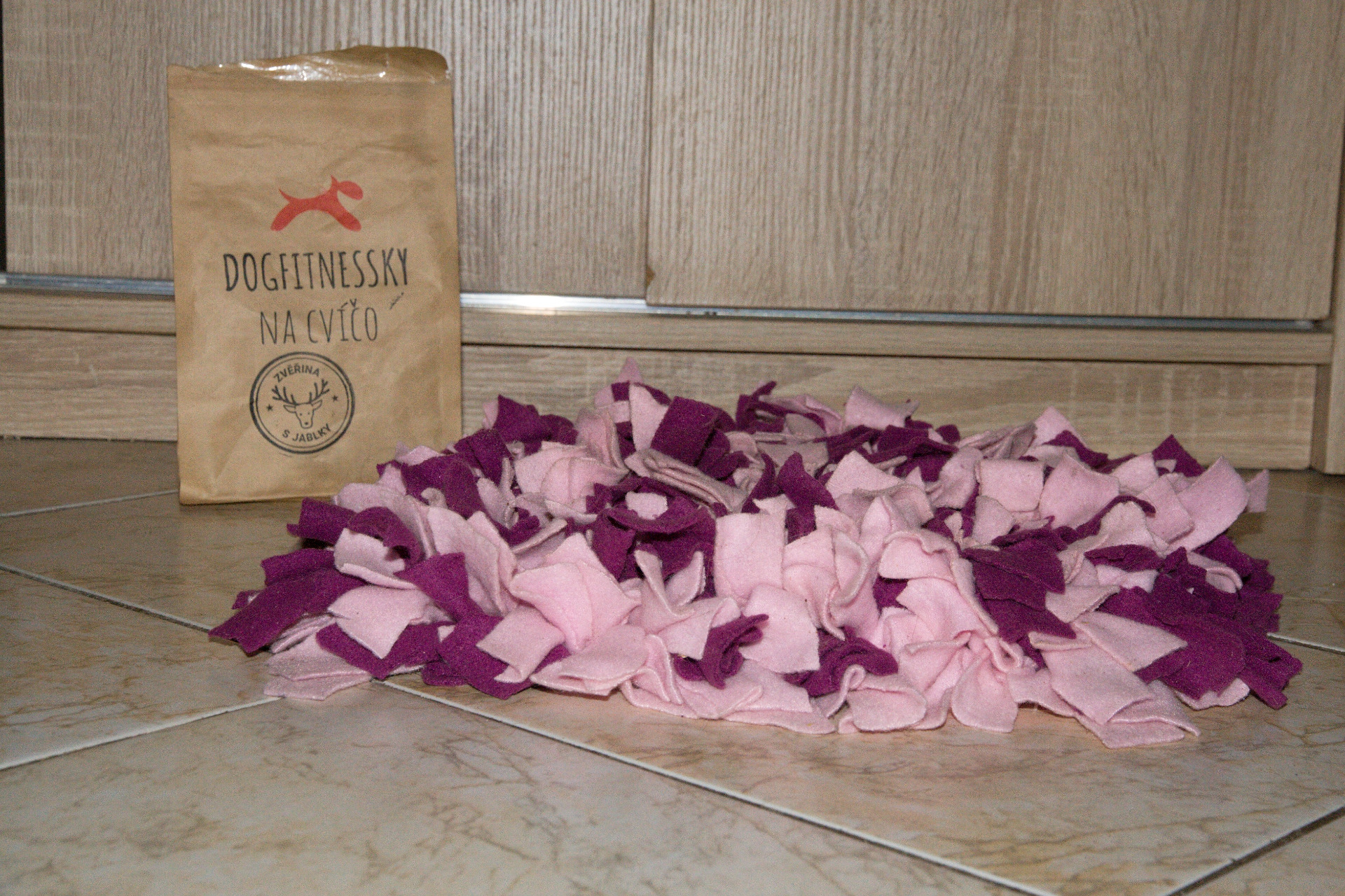 Myslím, že pojem čmuchací kobereček jste už slyšeli. Pokud ne, je čas vás s ním seznámit! Jedná se o hanmade kobereček vyrobený z pruhů z fleece deky, které jsou navázané na mřížce z protiskluzového materiálu. Pokud máte ruce alespoň trochu šikovné, zvládnete si ho vyrobit sami. Pokud jste v tomhle trošku leví, nevadí, kobereček z fleece deky můžete nahradit například čistým mopem na vytírání. Obojí funguje na principu schovávání mňamek mezi jednotlivé štětinky mopu/kousky látek. Pejsek musí u hlavolamů takového rázu hodně zapojovat čichový smysl, proto je to pro něj trochu náročnější.